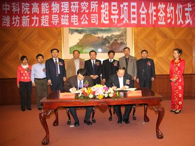 2009年12月10日上午,濰坊新力超導磁電科技有限公司與中科院高能物理研究所超導項目合作簽約儀式在濰坊富華大酒店舉行。出席儀式的有中科院高能所常務副所長王貽芳,濰坊市市長助理、高新區黨委書記、管委會主任趙志遠,濰坊新力超導磁電科技有限公司董事長兼總經理王兆連,中科院高能所所地合作辦公室主任王殿臣,中科院高能所超導磁體中心主任朱自安,濰坊市高新區副書記、管委會副主任張龍江,濰坊市高新區招商局局長房士華,中科院高能所項目管理員謝萬,濰坊新力超導磁電科技有限公司技術中心總經理劉風亮,濰坊新力超導磁電科技有限公司技術辦主任付佩超。